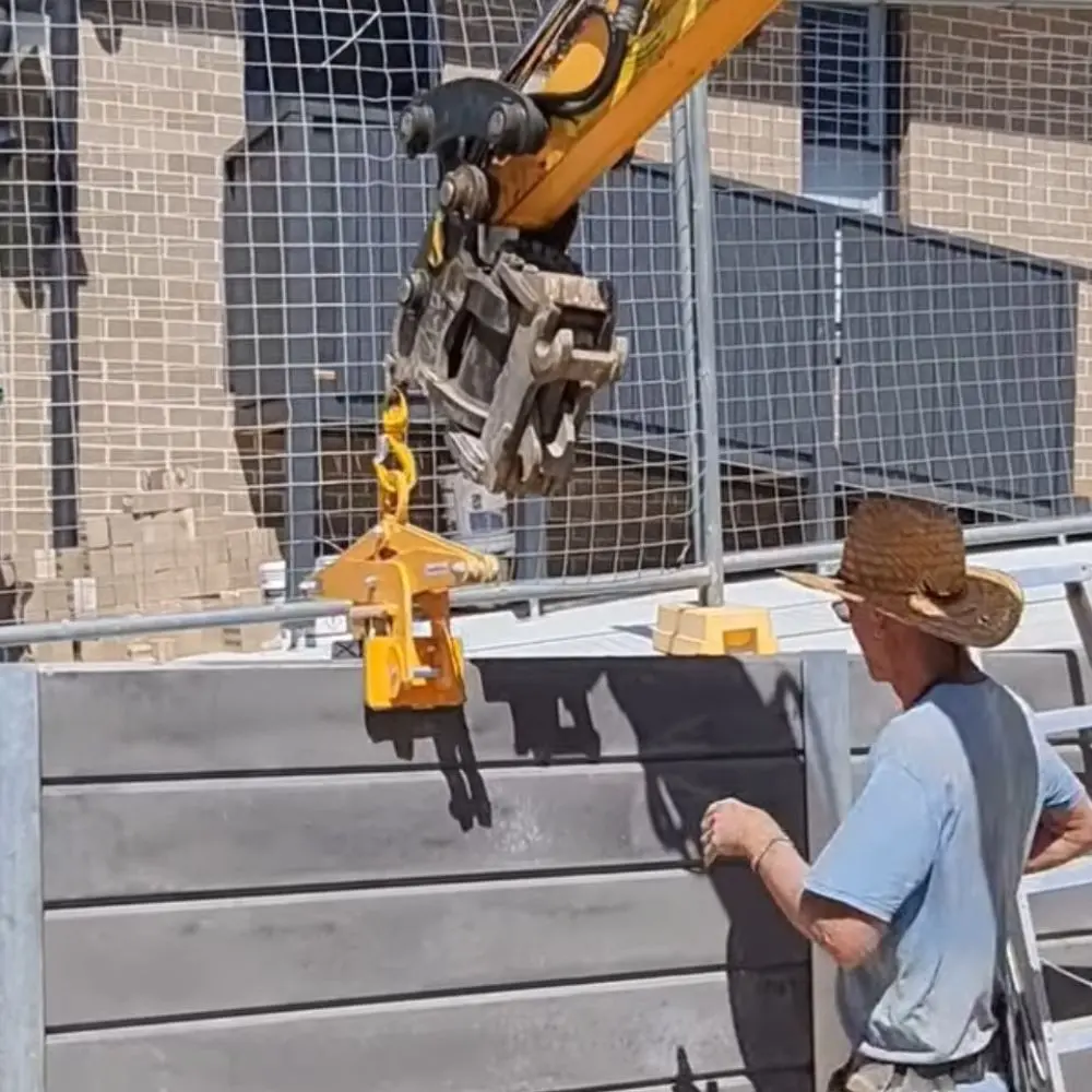 Ground preparation and support for timber and concrete sleeper retaining walls. Hydraulic grab attachment for rock walls.